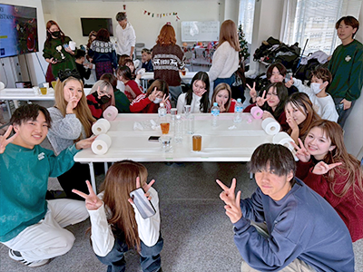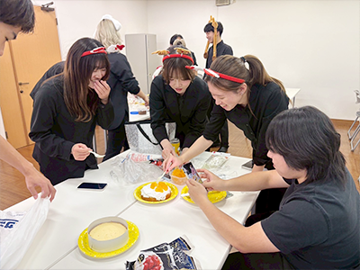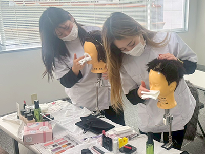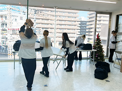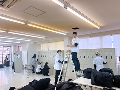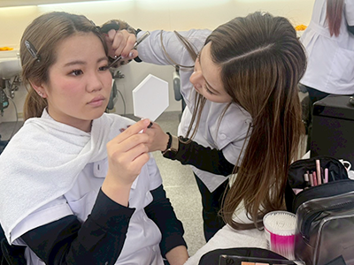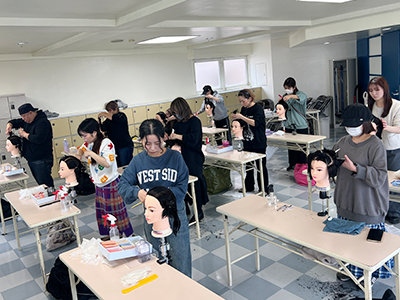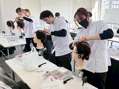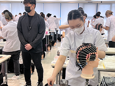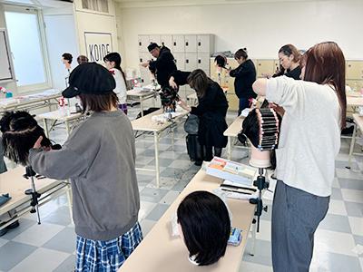 ブロー仕上げを本校の在校生にも助けてもらいながら