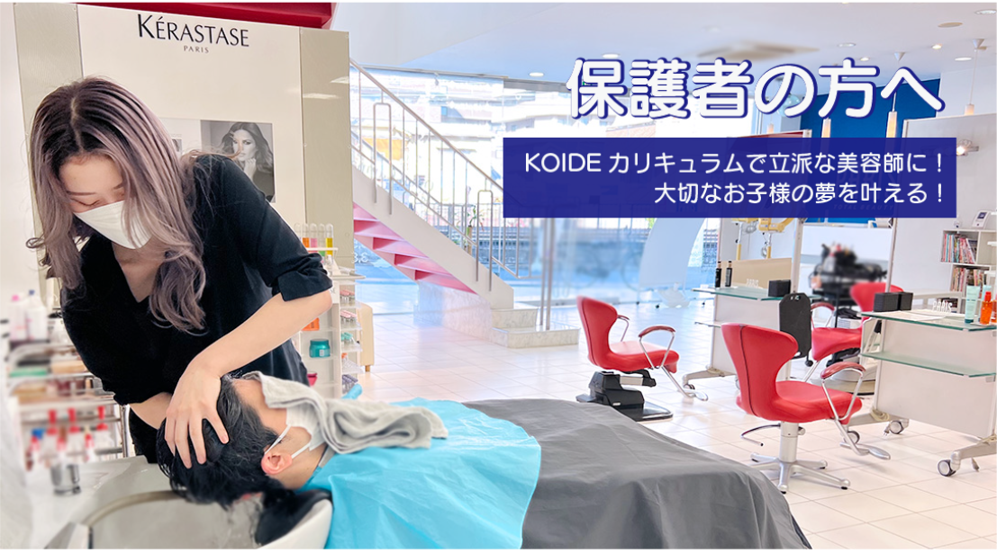 卒業後、すぐに活躍できる美容師を育成するカリキュラムを実施。実際にお客様を接客する実地研修を積み重ねることで、リアルな接客力を技術を身につけます。また、メイク、ネイル、着付け、まつ毛エクステンションなど、現場で必要とされる幅広い知識とスキルを学びます。KOIDEの講師陣は、経験豊富な現役のサロンオーナーやトップスタイリスト。自らが現場に立つことで、美容師の先輩として技術力や接客力を身につけられるよう指導しています。